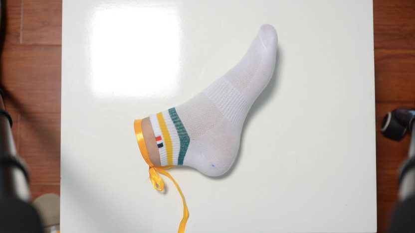 旁邊放著一雙白襪子,黃綠色的條紋鮮豔奪目,襪口還綴著小小的三色旗。我拿起一隻,慢慢地套在腳趾上,布料貼合著每一處曲線,將柔軟的粉紅色腳底和腳踝完全包裹起來。